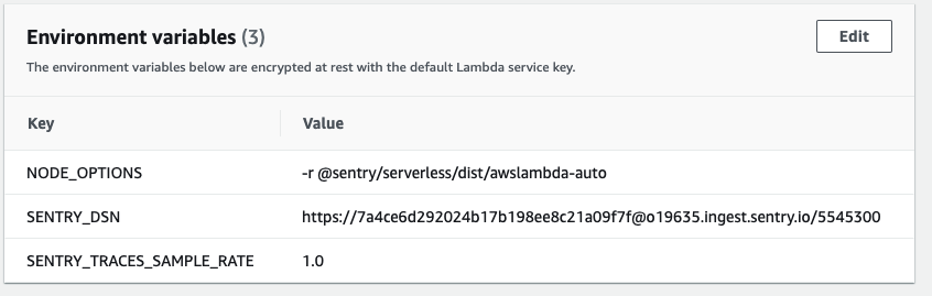 • NODE_OPTIONS: This is to preload the awslambda-auto module which will automatically initialize Sentry
