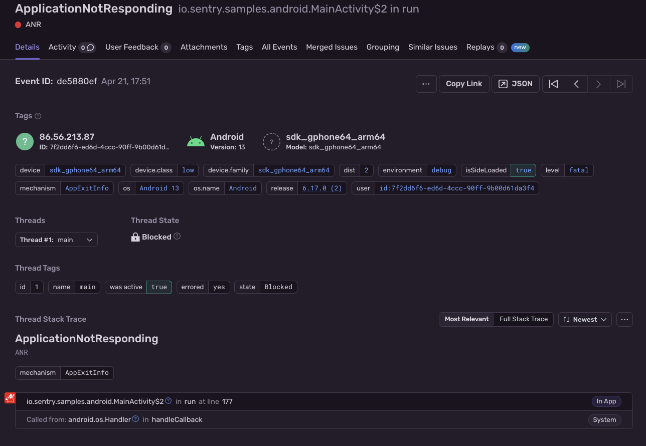 The new implementation (v2) uses the same data source as Google Play Console. This means the reported ANR events and ANR rate should match with what you see on Sentry. The new implementation also captures a thread dump with additional information, like held locks, to help you resolve ANRs more efficiently.